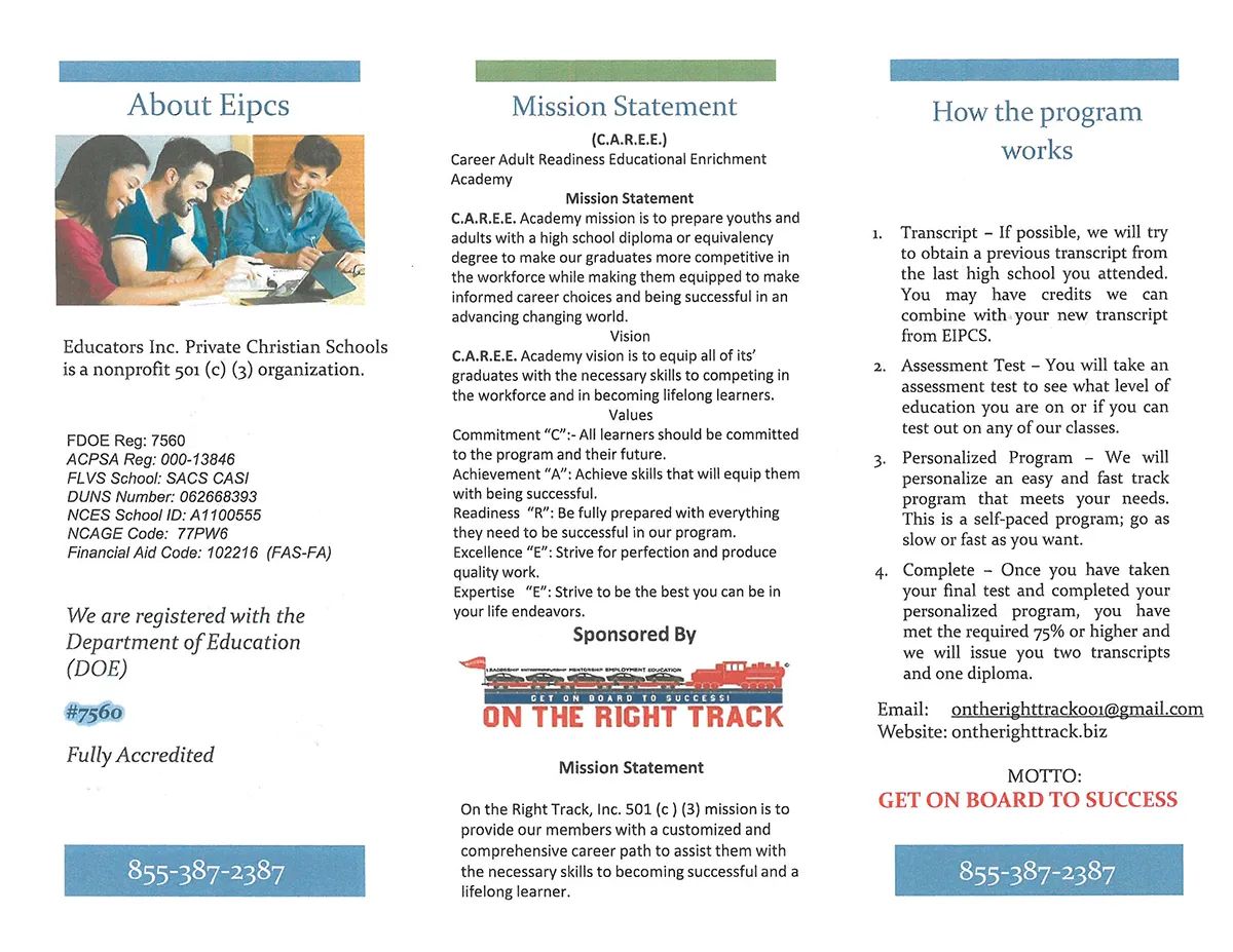 On the Right Track, Inc, 501(c)(3) mission is to provide our members with a customized and comprehensive career path to assist them with the necessary skills to becoming successful and a lifelong learner.